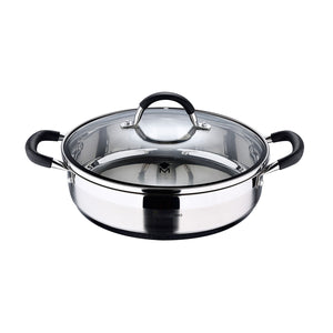 Die Masterpro Kochtopf mit Deckel wurde entwickelt, um eine praktische und langlebige Kocherfahrung zu bieten. Hergestellt aus 18/10 Edelstahl, einem Material, das für seine Widerstandsfähigkeit, Langlebigkeit und einfache Reinigung bekannt ist. Mit den Maßen 28x7 cm und einem Fassungsvermögen von ca. 3,8 Litern eignet er sich ideal für Eintöpfe, Suppen oder Gerichte, die gleichmäßiges Garen erfordern. Der Boden verfügt über eine voll induktionsfähige ferromagnetische Struktur, die die Nutzung auf allen Herdarten, einschließlich Induktion, ermöglicht und eine gleichmäßige Wärmeverteilung sowie Energieeffizienz garantiert. Die Griffe mit Silikoneinsätzen bieten sicheren und komfortablen Halt, bleiben während des Kochens stets kühl, um Verbrennungen zu vermeiden und die Handhabung zu erleichtern. Zudem hilft das Design mit inklusive Deckel, Wärme und Aromen zu bewahren, was langsames und gleichmäßiges Garen fördert. Die schwarze Außenbeschichtung verleiht einen modernen Look und verbindet Funktionalität mit Ästhetik, während die Herstellung in China den von Masterpro festgelegten Qualitätsstandards für Kochutensilien entspricht. Dieser Kochtopf ist eine ausgewogene Wahl für alle, die ein zuverlässiges, vielseitiges und pflegeleichtes Kochgeschirr für den anspruchsvollen Haushalt suchen.